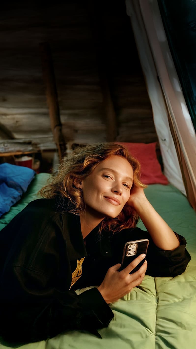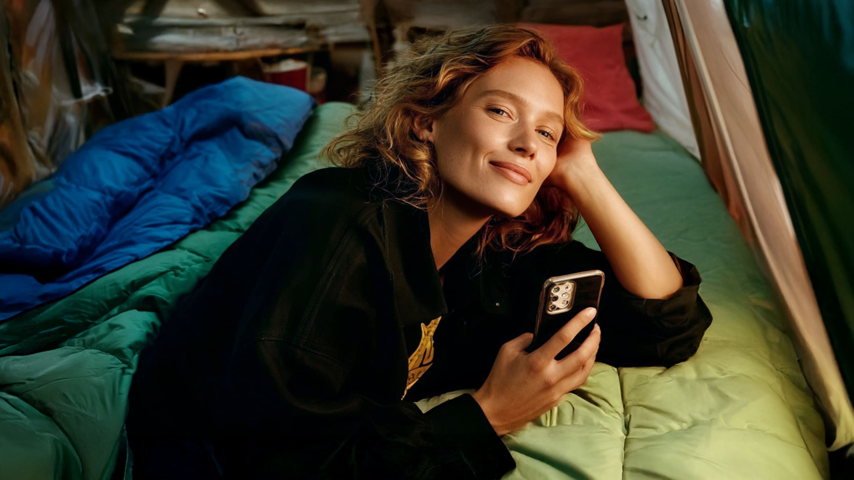 o femeie sprijinita de un telefon mobil de acceasi inaltime cu ea, pe al carui ecran ruleaza aplicatia de Mobile Banking